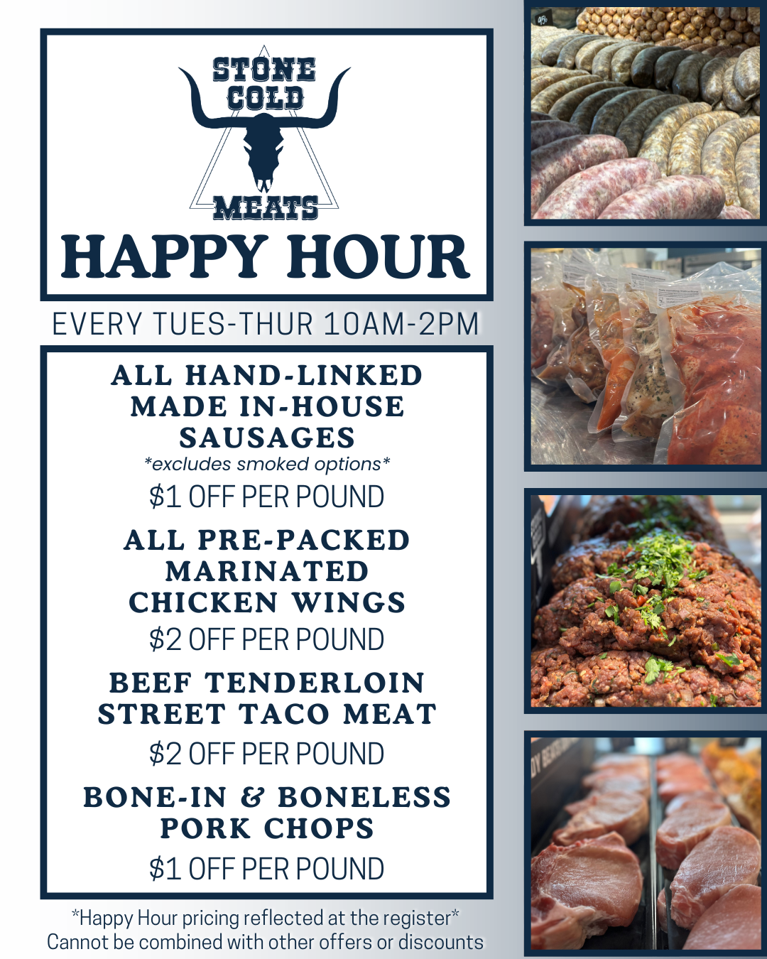 Some love for all of our early birds, enjoy Happy Hour every Tues-Thur when you shop at Stone Cold Meats.