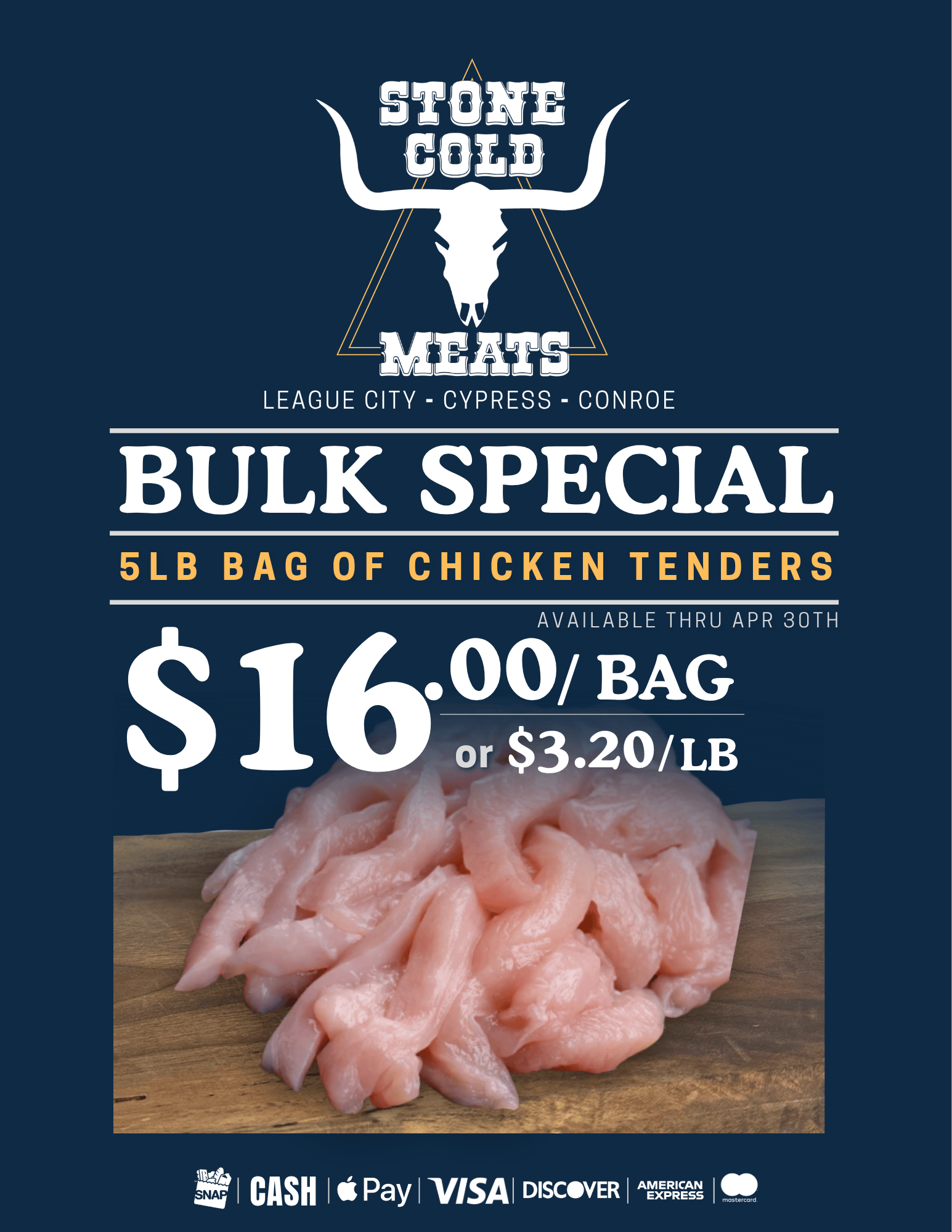Pick up 1 LB of flank steak at $16.99/lb + our April Bulk Special (Bulk Chicken Tenders – 5LBS for $16) and get 5 FREE 8oz brisket burgers!